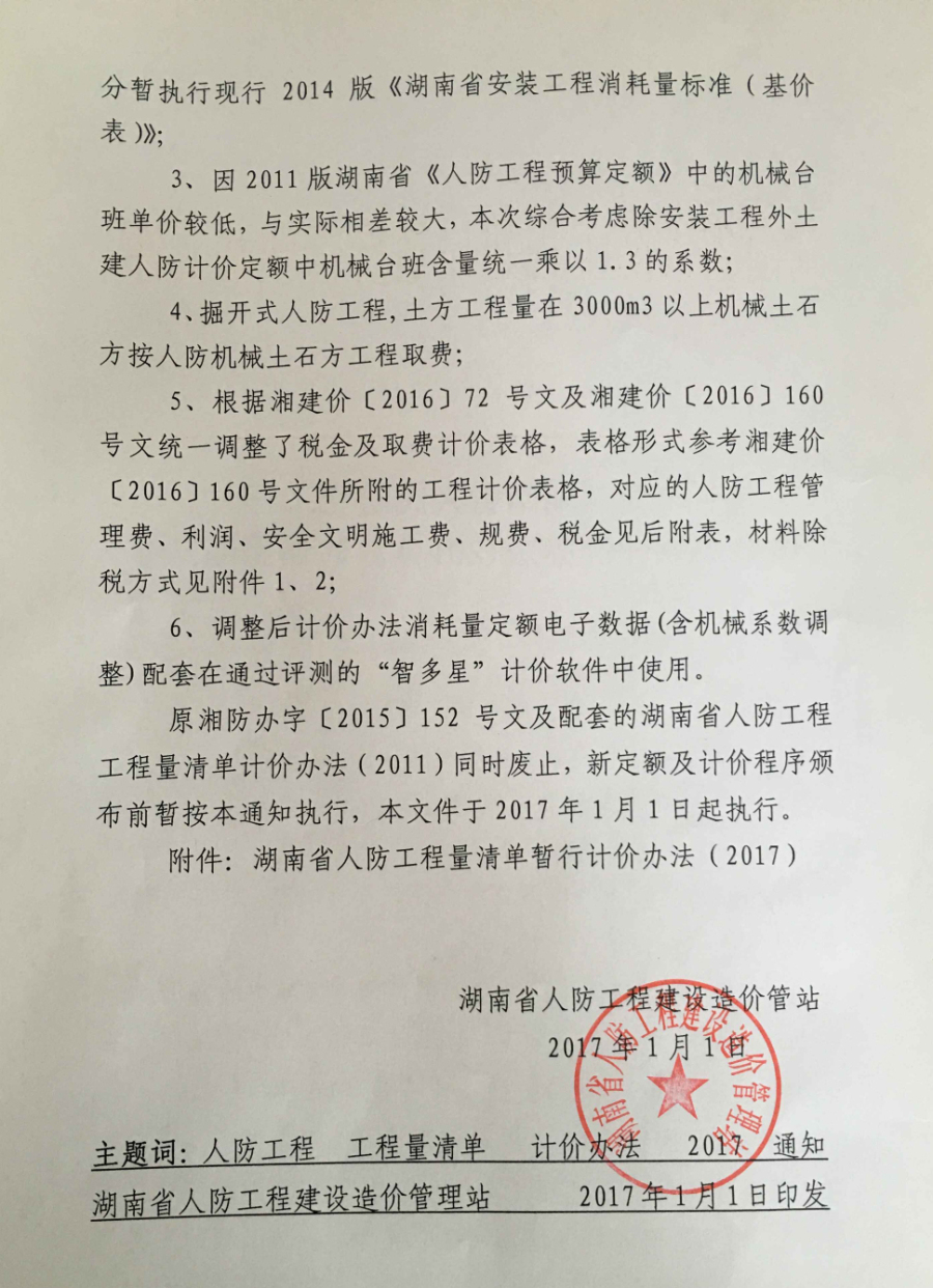 湖南省人防工程建設(shè)造價(jià)管理站于2017年1月1日發(fā)布了湘防價(jià)管字[2017]01號(hào)關(guān)于印發(fā)《湖南省人民防空工程工程量清單計(jì)價(jià)辦法(2011)》的調(diào)整通知。湖南人防定額全面實(shí)施營(yíng)改增,現(xiàn)智多星工程項(xiàng)目造價(jià)管理軟件已同步更新?,F(xiàn)將相關(guān)升級(jí)事宜規(guī)定如下: