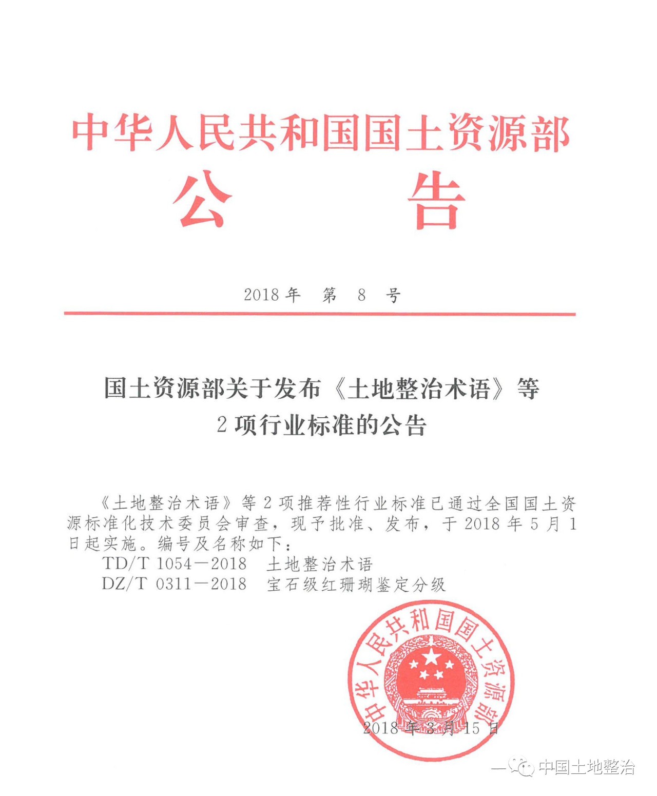 2018315日,國(guó)土資源部印發(fā)2018年第8號(hào)公報(bào),批準(zhǔn)、發(fā)布《土地整治術(shù)語(yǔ)》(TD/T 1054-2018)行業(yè)標(biāo)準(zhǔn),于201851日起實(shí)施。這是繼土地整治工程技術(shù)人員納入國(guó)家職業(yè)分類大典(2015年,GBM20237L)、土地整治工程專業(yè)納入教育部本科專業(yè)目錄(2016年,082306T)、土地整治服務(wù)納入國(guó)民經(jīng)濟(jì)行業(yè)分類新國(guó)標(biāo)(GB/T 4754-2017,N-79-791),土地整治行業(yè)又一件具有里程碑意義的重大事件,標(biāo)志著土地整治技術(shù)體系和業(yè)務(wù)體系進(jìn)一步建立健全,土地整治學(xué)科建設(shè)和業(yè)務(wù)建設(shè)取得了關(guān)鍵性突破。