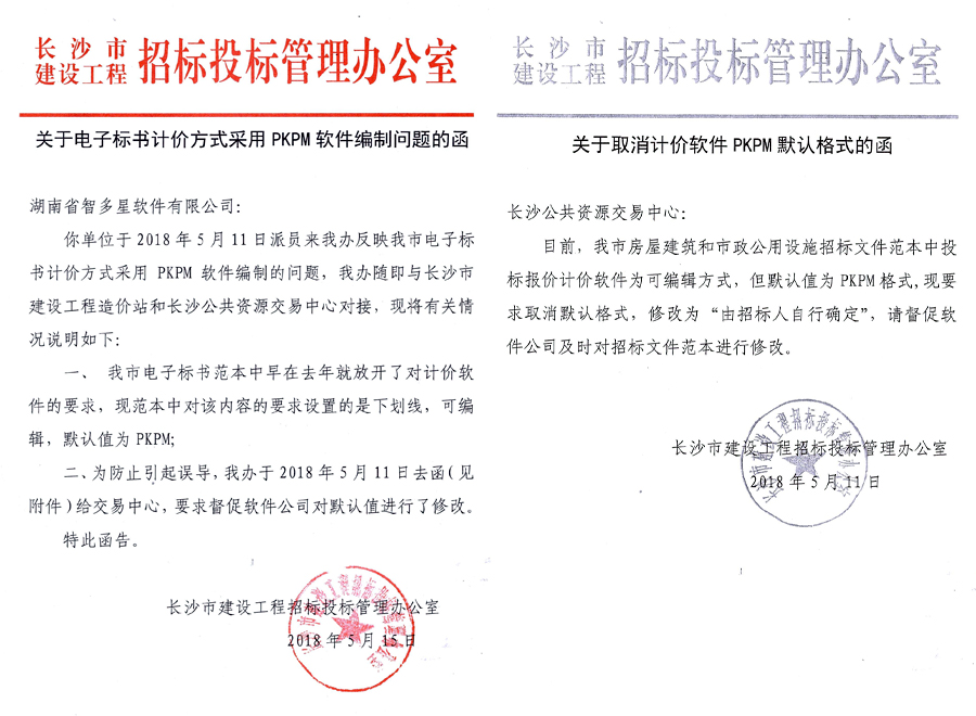 這種有悖公平、公正市場(chǎng)原則的做法,既損害了其他造價(jià)軟件公司的利益,更迫使建設(shè)工程造價(jià)從業(yè)單位增購(gòu)PKPM軟件,大幅增加了建設(shè)工程造價(jià)從業(yè)單位的負(fù)擔(dān),社會(huì)影響十分惡劣。湖南智多星軟件有限公司作為湖南省工程造價(jià)軟件唯一一家新三板掛牌企業(yè),我們有責(zé)任替廣大造價(jià)軟件用戶和企業(yè)說話,因而我們毅然決然對(duì)這種不公平的現(xiàn)象說“不”!在2018年5月,我公司通過信函、上門的方式,積極向紀(jì)檢及相關(guān)職能部門進(jìn)行投訴反饋,通過多次溝通協(xié)商,2018年5月11日,長(zhǎng)沙市招標(biāo)辦正式發(fā)函,取消在長(zhǎng)沙市建設(shè)項(xiàng)目招投標(biāo)過程中默認(rèn)PKPM計(jì)價(jià)軟件,改為通用格式,并正式通知長(zhǎng)沙市公共資源交易中心,要求其在標(biāo)書模板上進(jìn)行修改(見附件)。我公司也于2018年5月17日收到長(zhǎng)沙市公共資源交易中心的正式通知,告知我司標(biāo)書模板已修改完成。在日后的建設(shè)工程造價(jià)工作中,若再次遇到指定使用PKPM軟件的情況,歡迎向我公司反饋,我們將全力配合調(diào)查取證,并積極向上級(jí)主管部門舉報(bào)。