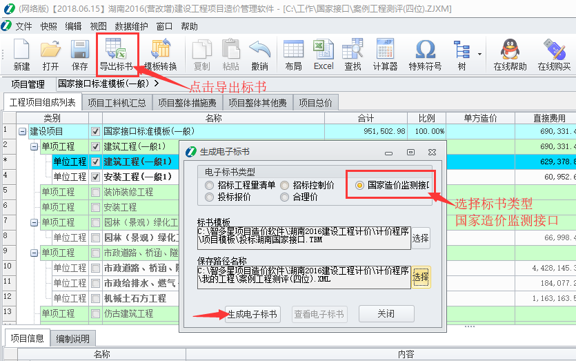 2、隨后找到工具欄的【導(dǎo)出標(biāo)書】按鈕,彈出的窗口類型選擇國(guó)家接口監(jiān)測(cè)接口,標(biāo)書模板路徑無(wú)需設(shè)置軟件會(huì)自動(dòng)匹配,最后選擇需要保存的路徑后生成電子標(biāo)書,默認(rèn)生成在和工程同一路徑,導(dǎo)出即可。如圖: