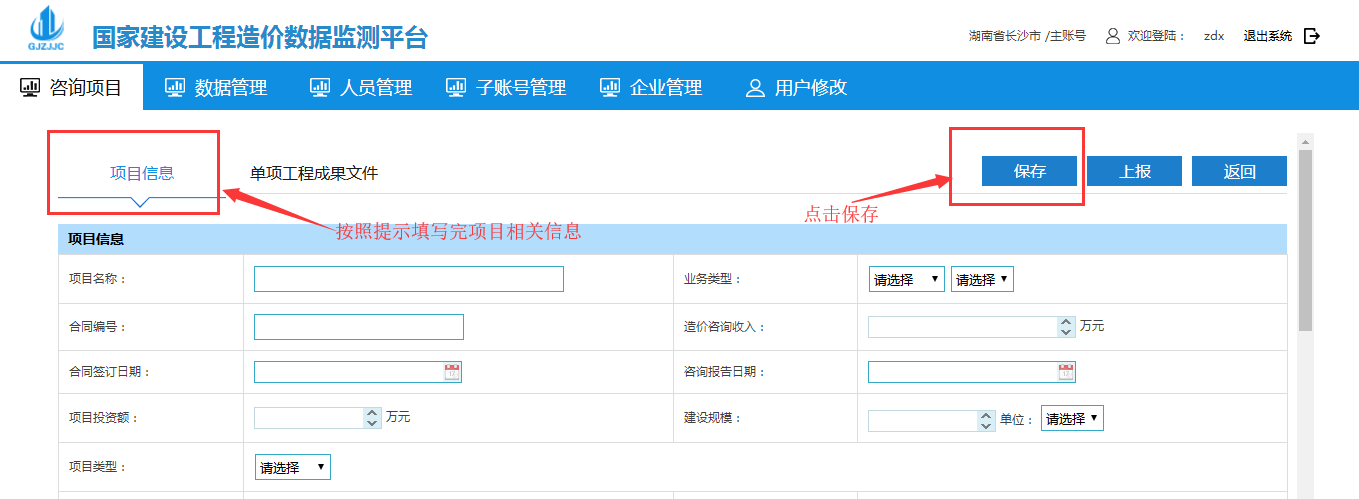 2、進(jìn)入新建項(xiàng)目后默認(rèn)在咨詢項(xiàng)目中的項(xiàng)目信息界面,錄入完整的信息然后點(diǎn)擊保存按鈕: