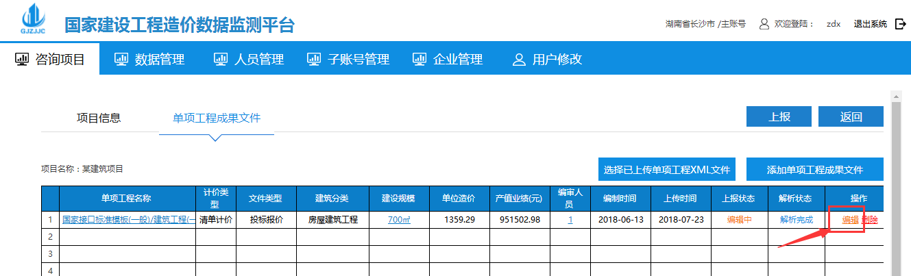 4、上傳成功后在單項(xiàng)工程成果文件界面點(diǎn)擊以上傳的文件后面操作欄中的編輯: