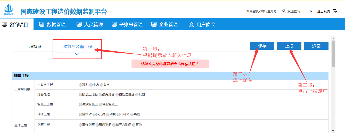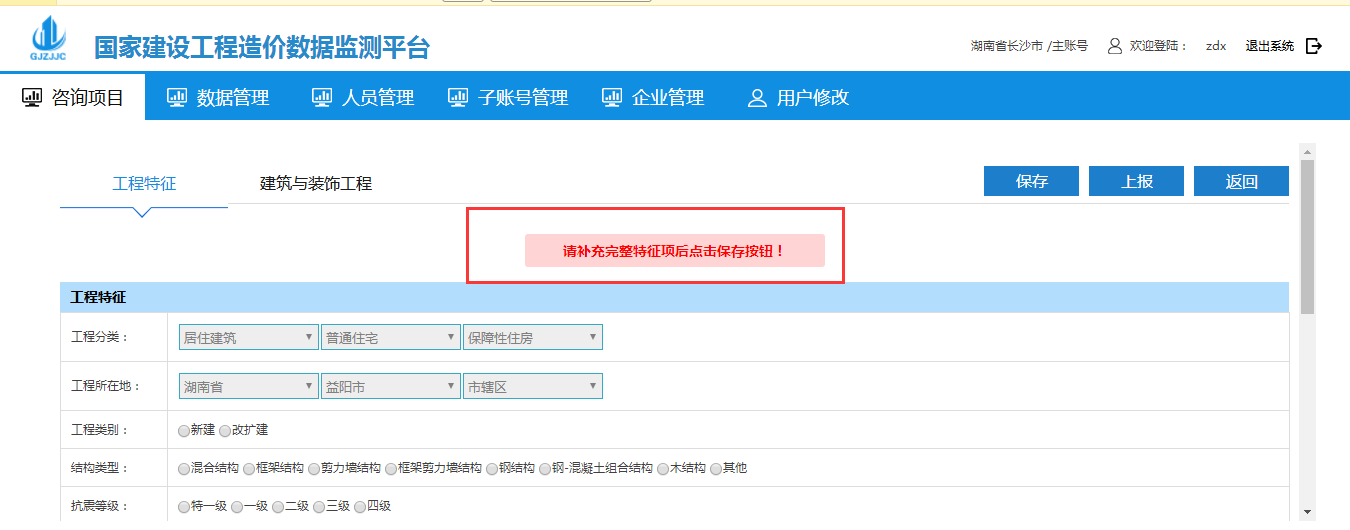 點(diǎn)擊到建筑與裝飾工程界面根據(jù)提示錄入完整特征項(xiàng)后點(diǎn)擊保存按鈕,保存完成后點(diǎn)擊上報(bào)即可: