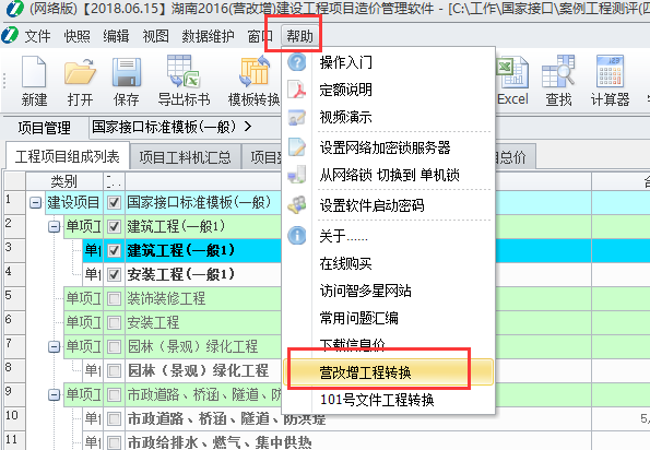 1、首先,打開(kāi)16版計(jì)價(jià)軟件后點(diǎn)擊工具欄幫助下的101文件轉(zhuǎn)換。