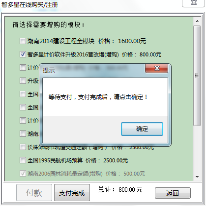 第四步:勾選”智多星計(jì)價(jià)軟件升級(jí)2016營(yíng)改增(增購(gòu))“,或任意一項(xiàng)您需要購(gòu)買(mǎi)的模塊,之后點(diǎn)擊“付款”按鈕;