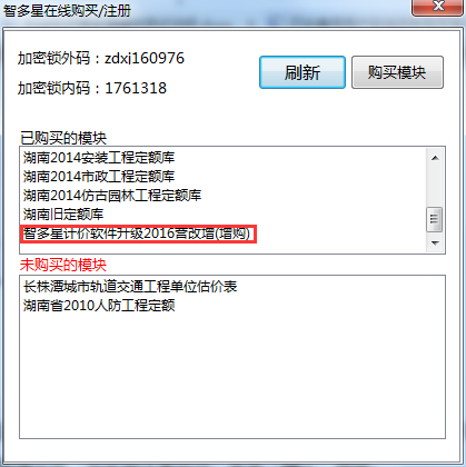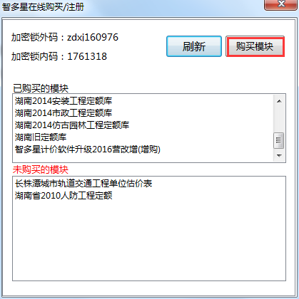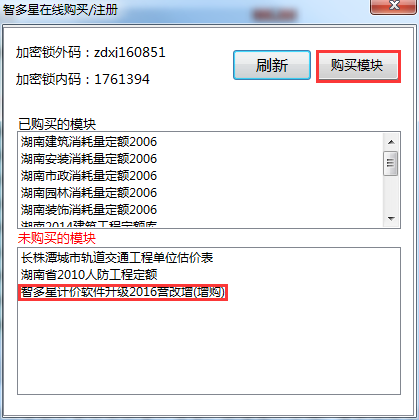 第三步:在軟件主界面,點(diǎn)擊上方“在線購(gòu)買(mǎi) ”按鈕(1),在未購(gòu)買(mǎi)模塊中會(huì)出現(xiàn)“湖南計(jì)價(jià)軟件升級(jí)2016營(yíng)改增(增購(gòu))”模塊,點(diǎn)擊“購(gòu)買(mǎi)模塊”按鈕(2):