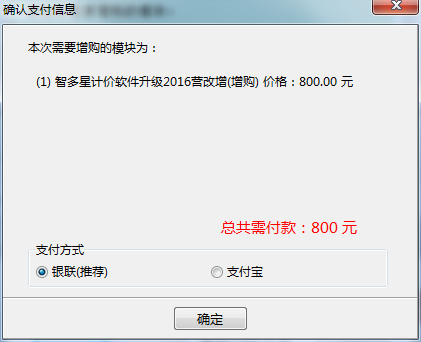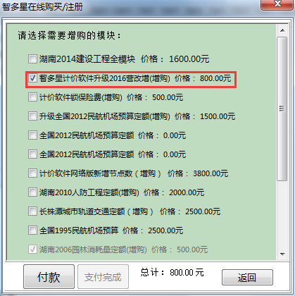 第四步:勾選‘智多星計(jì)價(jià)軟件升級(jí)2016營(yíng)改增(增購(gòu))’,或任意一項(xiàng)您需要購(gòu)買的模塊,之后點(diǎn)擊“付款”按鈕。